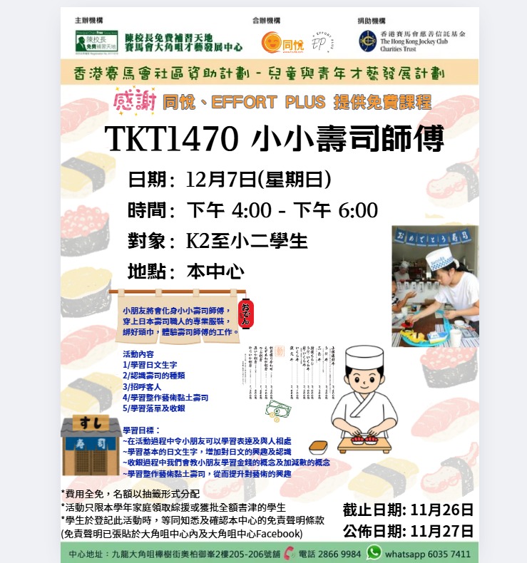 這場由《Effort Plus Workshop》與《同悅》合力推動的義工活動,獲得「香港賽馬會社區資源計劃|兒童與青年才藝發展計劃」的資助支持,讓更多孩子有機會免費參與、快樂學習。