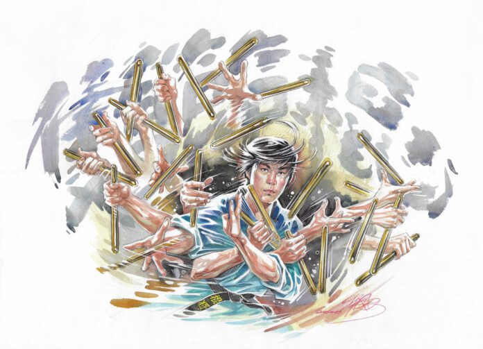 除了教學和推廣,劉師傅也用另一種方式記錄雙節棍。他與著名肖像畫大師和插畫師崔成安先生,出版了一本《雙節棍連環圖譜》,將動作、歷史、精神都畫成漫畫,像一本現代版的武功秘笈。