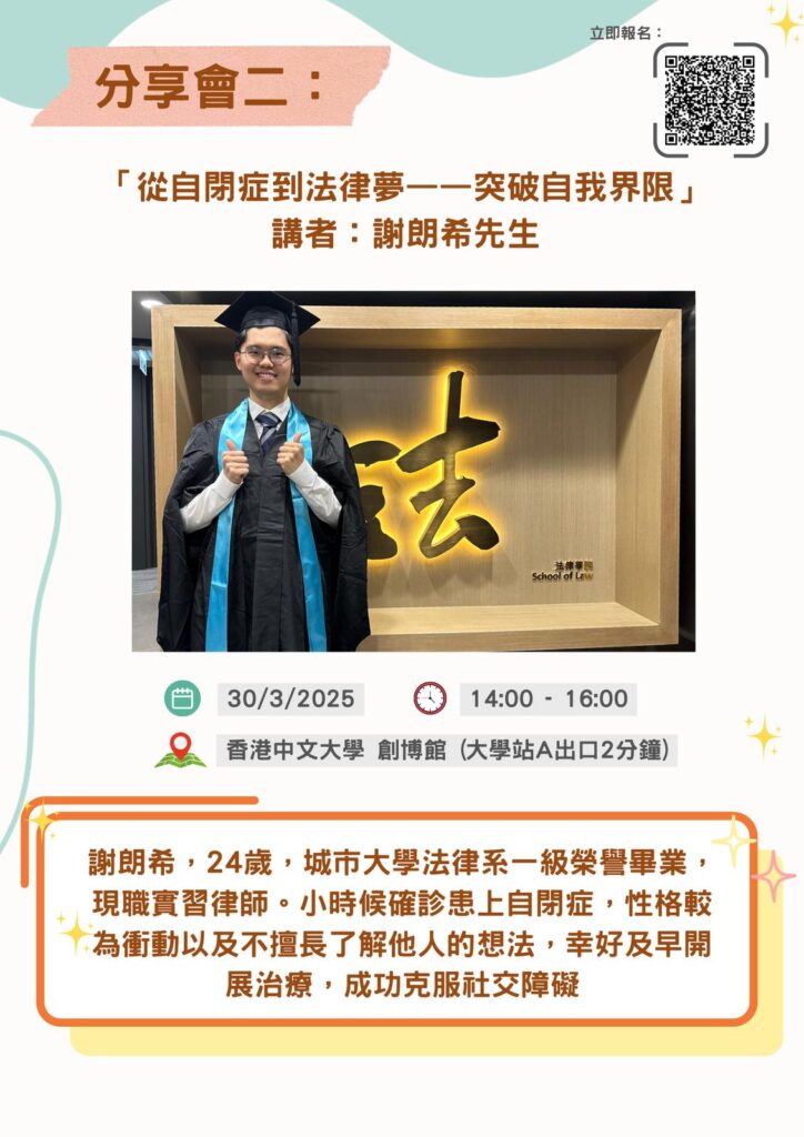 對於許多家長而言,孩子被診斷出專注力不足及過度活躍症(ADHD)或自閉症譜系障礙(ASD)可能是一場充滿困惑與挑戰的旅程。無論是學業、社交,還是情緒管理,這些孩子往往需要更多的理解與支持。然而,ADHD與ASD並非終點,而是一段可以克服的旅程。為了幫助家長更好地了解與應對這些情況,「有SEN有識:資訊分享會」特別邀請了兩位曾經歷相似挑戰的講者,分享他們如何在困境中找到方向,並最終突破自身界限,實現夢想。